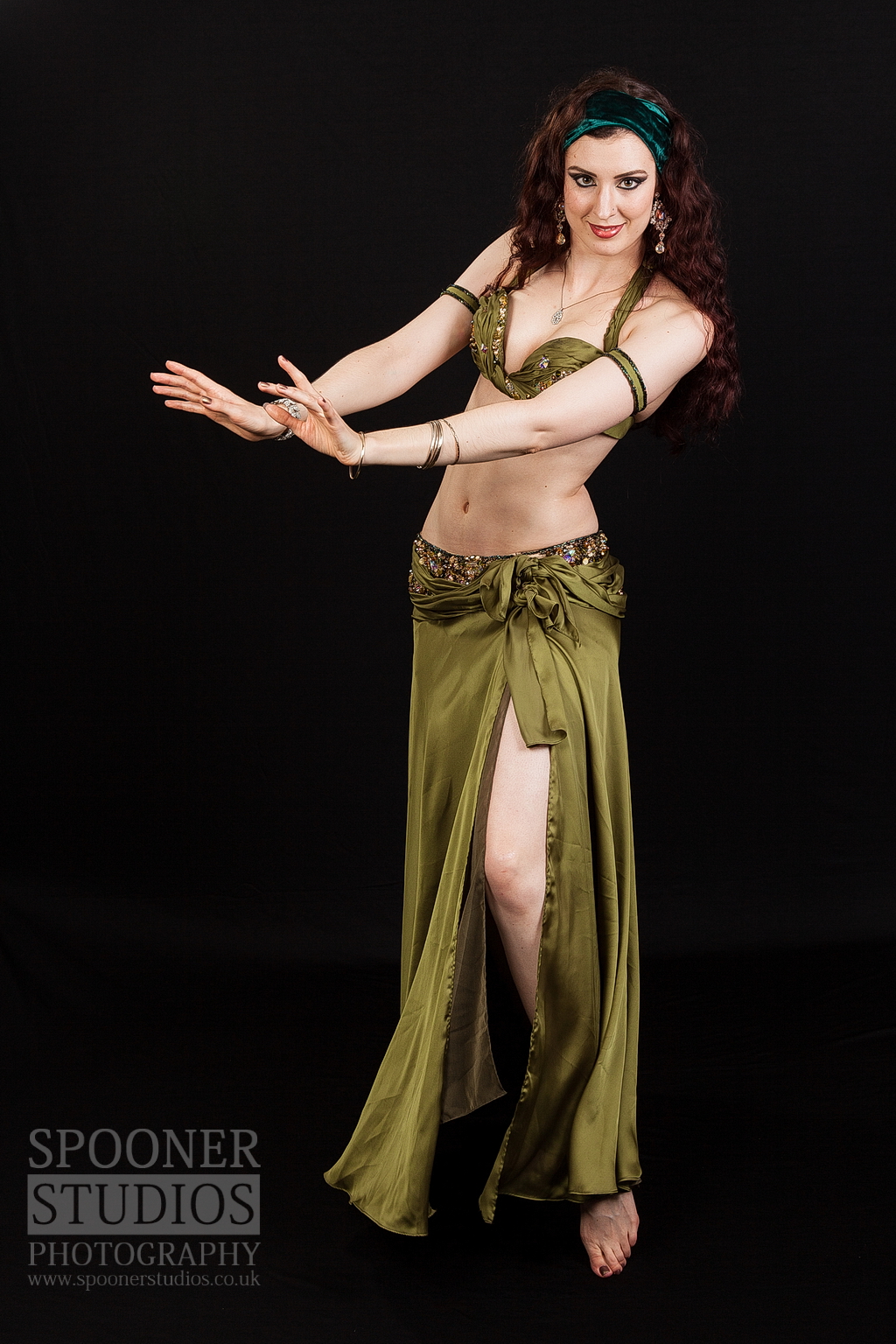 Oxford Bellydancer Rachael in an olive green costume
